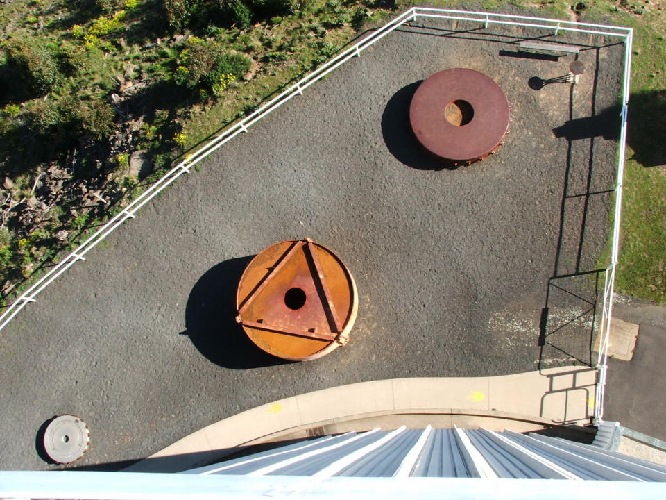Looking immediately down from the catwalk, at was probably the container for the primary mirror when it was transported. It is labelled with "Grubb Parsons" -- the manufacturer of the mirror.