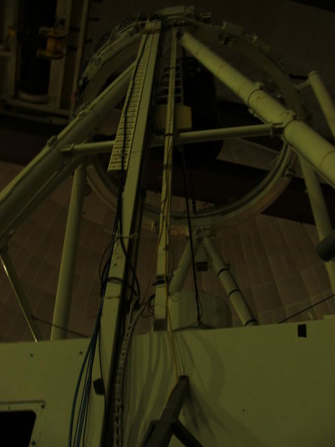 Looking up the truss of the telescope towards the secondary mirror or prime focus